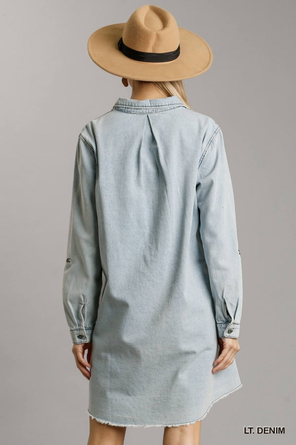Chest Pockets Collar Button Down Non-Stretch Denim Dress with Unfinished Hem